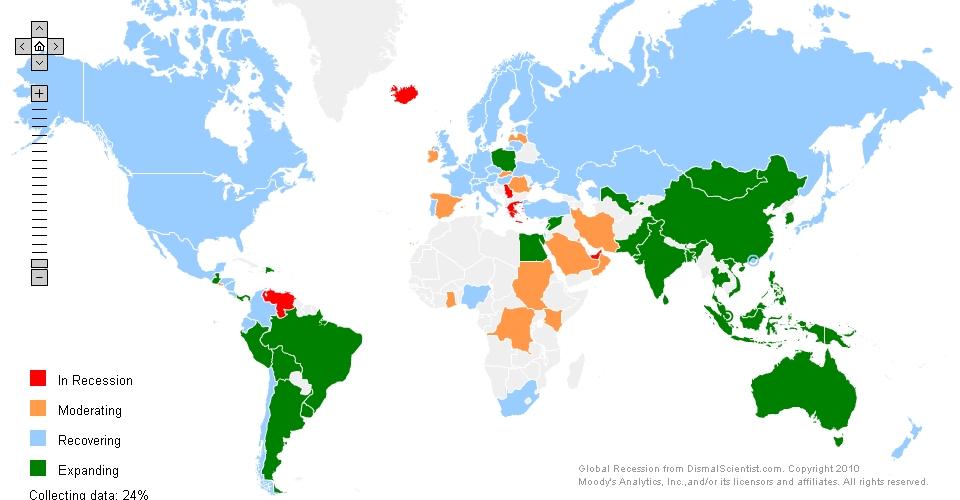 En el siguiente mapa podemos observar el estado actual de la recuperación económica mundial por países. Los países en color verde se encuentran en fase de expansión económica, los de color azul en recuperación, los de color rojo se encuentran todavía en recesión y el resto, en un color marrón claro ocre, en recuperación todavía moderada están en recesión moderada.