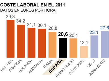 o Costes laborales.- En España son un tercio inferiores a los de Alemania y la mitad de los de Bélgica. Los datos de Eurostat muestran que el problema de las empresas españolas no son los salarios de los trabajadores. Luego en principio estamos tratando de ajustar una variable que no sería necesario. ¿Por qué?: porque se está tratando de repercutir a los trabajadores el importante gasto financiero incurrido por muchas de nuestras empresas cuyo crecimiento desordenado lo ha sido a base de un endeudamiento irracional, ilógico y anormal. Por lo que se debería proceder, con todas sus consecuencias, a un desapalancamiento y venta de todas aquellas participaciones que tienen bloqueadas financieramente a nuestras empresas y volver a ratios de deuda razonables y consecuentes.