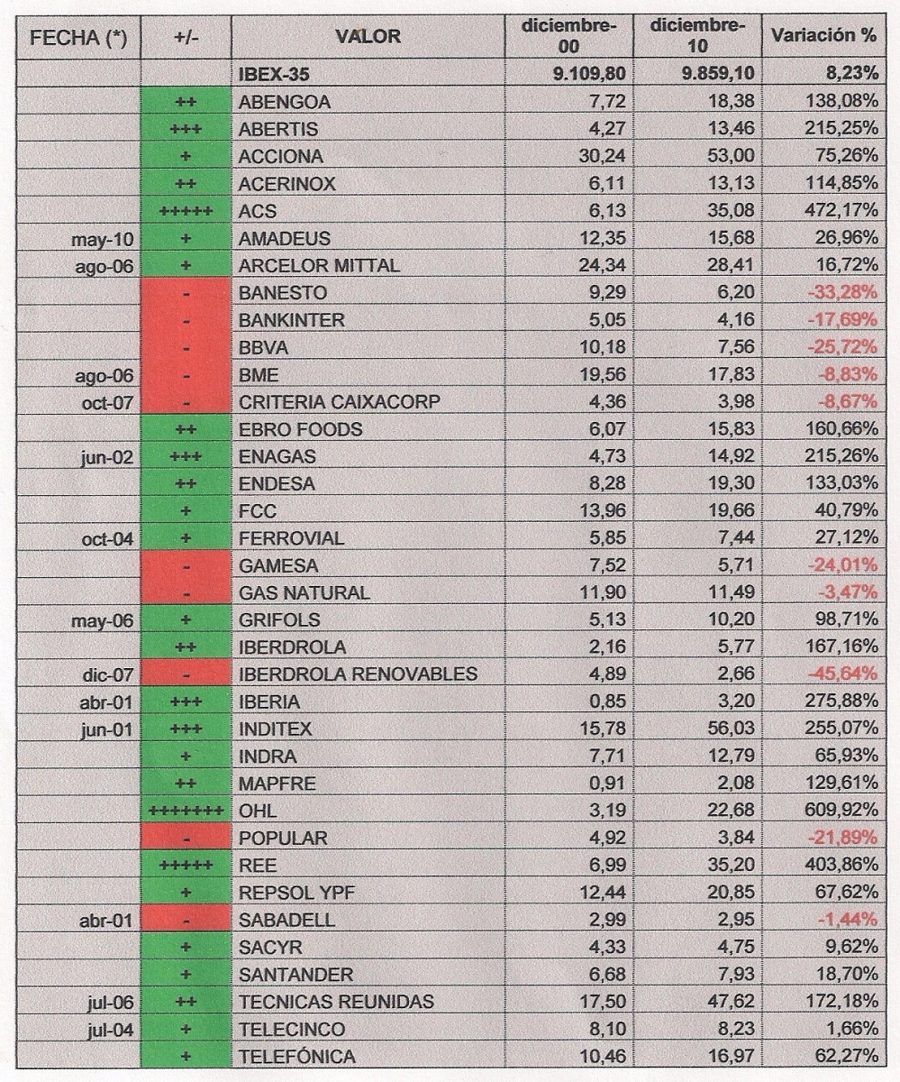 No obstante, si analizamos ahora la evolución de los diferentes valores que componen el Ibex 35, podemos observar como existen valores, con rentabilidades por encima del 600%, caso de OHL, o del 400% como ACS o REE. Y varios han superado rentabilidades del 200%, como Iberia, Inditex, Enagas o Abertis. Por abajo, en el pelotón de cola los bancos, Banesto, BBVA, Popular, Bankinter y Sabadell, que han cerrado la década con rentabilidades negativas, que van del -33,28 de Banesto al -1,44 del Sabadell. También Gamesa, Bolsas y Mercados y Gas Natural, cierran la década con rentabilidad negativa.