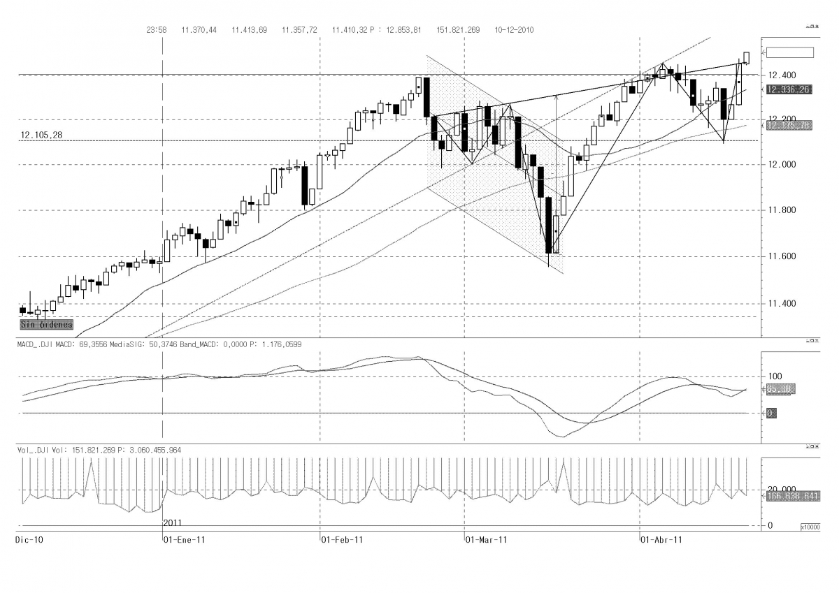 La noticia se las traía. La nación más poderosa de la tierra, veía su solvencia cuestionada, por un agencia de calificación de su propio país. ¿Cúal era el mensaje?. ¿Se trata de una guerra entre la administración Obama y el poder económico? o ¿entre los republicanos y los demócratas?. Dificil de contestar a estas cuestiones, pero algo si ha quedado claro, el índice DJIA 30, sigue subiendo a pesar de todo. ¿Hasta cuando?. Desde un punto de vista técnico la tendencia es impecablemente alcista en cualquier plazo.La figura que nos deja ahora presenta una proyección de casi 700 puntos, hasta lograr la cota de 13.100 puntos, casi un 6% de subida para las próximas semanas. Sólo la perdida al cierre de los mínimos de lunes pasado, pondría en cuestión este escenario.