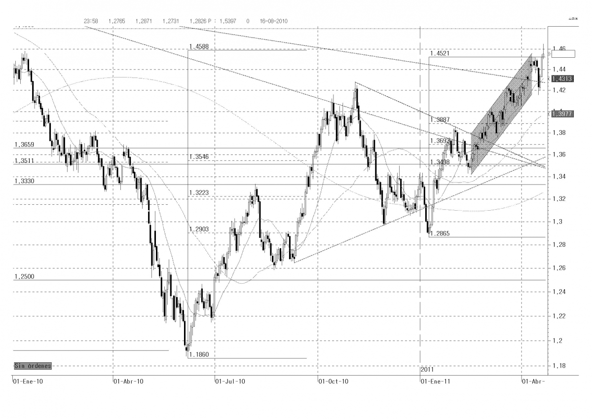 Por otra parte, tenemos que fijarnos en la cotización del euro-dolar. Desde que a principios de Enero, tocase mínimos en 1,2870, se ha revalorizado más de un 13 %, hasta cerrar el jueves en 1,4553, después de tocar un máximo en 1,4650, niveles que perdió en diciembre de 2009. Ha roto también la directriz bajista de largo plazo, que une los máximos de 2008 y 2009, lo cual da consistencia a la subida que experimenta la cotización. Todo ello, en un escenario convulsivo de la deuda soberana de algunos países, llamados periféricos, de la U.E., entre los que se cuenta España, quinta potencia de la Unión europea por su PIB, según paridad del poder adquisitivo.