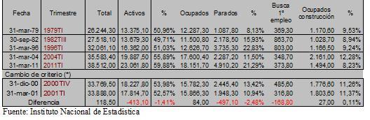 La tercera es que a partir del 1º trimestre de 2001, no son comparables los datos con los anteriores debido al cambio de método de evaluación de los datos, cuando se redujo el paro en 497.100 personas por los cambios de criterio.