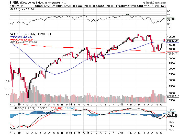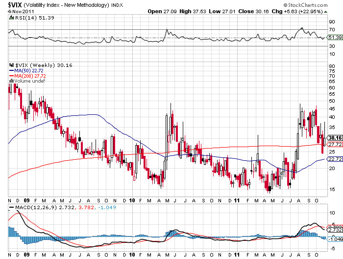 Si observamos el gráfico del índice vix de volatilidad en cierres semanales, vemos que desde los máximos de principios de 2009, la volatilidad aumento con crudeza en Mayo-10 y en Agosto de este año. Actualmente parece estar relajándose y querer volver a términos más estables. Cuestión necesaria pero no suficiente, si queremos ver cerrar en positivo nuestro índice selectivo. Como nos indica el cierre del primer semestre de nuestro