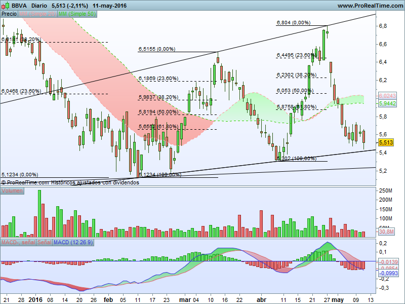En el C/P, BBVA tiene como soporte intermedio 5,30 € ( débil) y luego los 5,15 €.