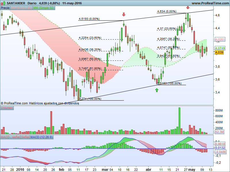 Del gráfico, podemos destacar como positivo, que el volumen de las últimas bajadas es bajo, al igual que el del IBEX y del SAN.