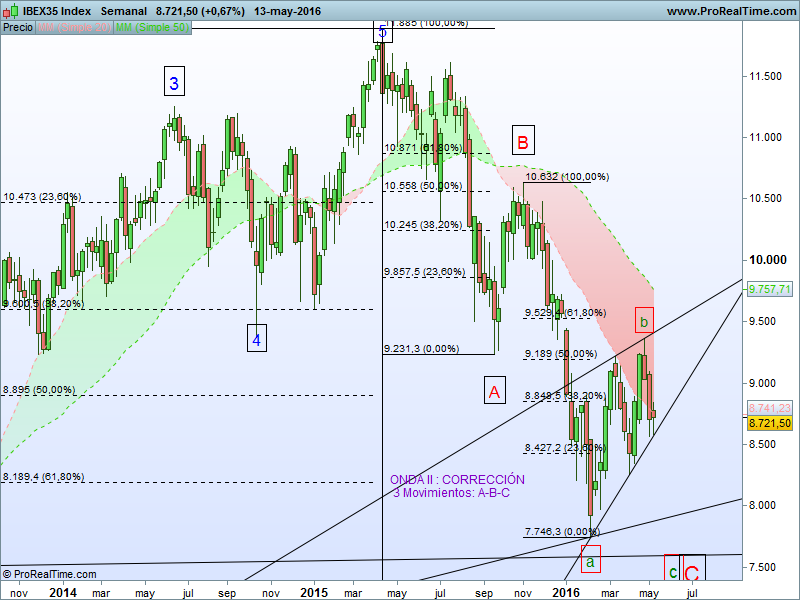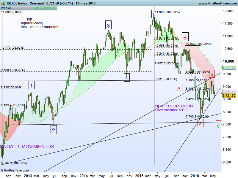 Por conteo de ondas, proporciones de Fibonacci, figuras chartistas, por lo indicado antes, y un sinfín de "elucubraciones", ideas y pensamientos más, que no vienen al caso o tal vez sí, considero que de perderse los mínimos de feb-16 bien podríamos marcar un nuevo más o menos en las cercanías de los 7.580 puntos.