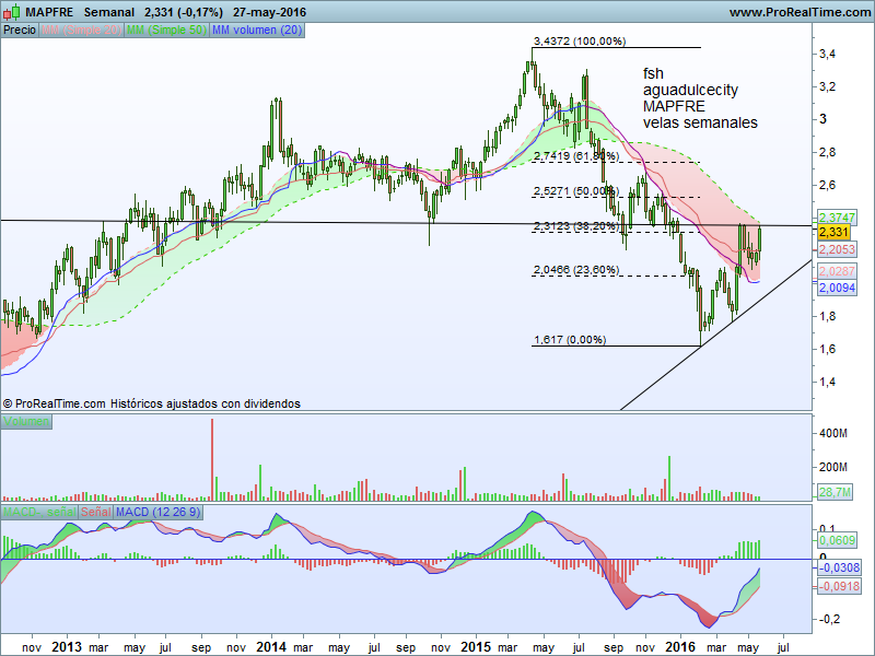 Como lo mío es "mojarme", y dar mi "opinión", pues creo que está destinada a superar la zona de los 2,35 € y continuar al alza, pero ello no implica que antes no tenga que volverse a apoyar en la directriz que une los últimos mínimos crecientes de feb. y abr-16.