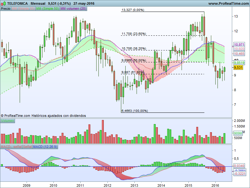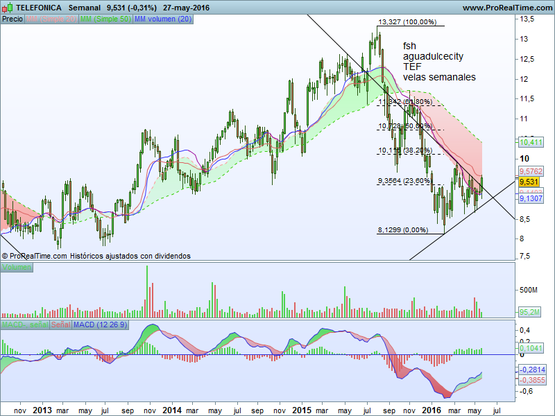 Hola, les traigo un gráfico de Telefónica en velas semanales para discernir la cuestión del título.