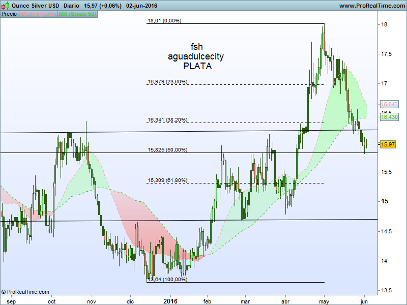 Hola, hoy parece que la plata empieza a "brillar" de nuevo, tras la corrección de los últimos días desde los 18 $ del 02/05/16 hasta los 15,8 $ del 01/06/16 .