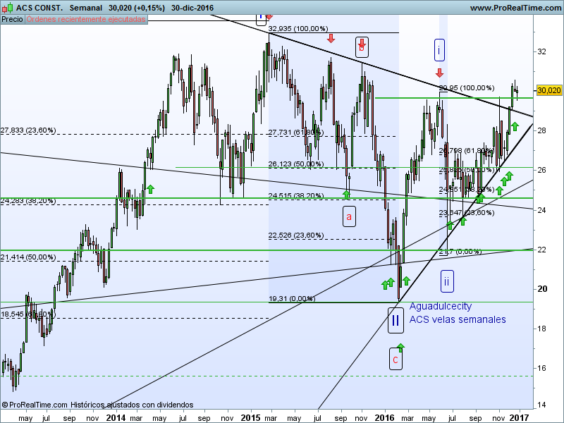 - Onda III (alcista): Habría nacido en los 19,31 € de feb-16 , entando en desarrollo actualmente. Respecto a dónde finalizará esta onda, de momento prefiero no perder el tiempo en intentar adivinar, sí leen bien, adivinar, pero puestos a dar una cifra pues 38 € es una cota bastante posible. Esta onda se debería realizar en 5 ondas menores( i- ii- iii- iv- v), de las que habríamos visto la "i" finalizada en 29,95 € ( 03/06/16) y la "ii" terminada en 21,70 € (24/06/16), y ahora estaríamos en desarrollo de la "iii" .