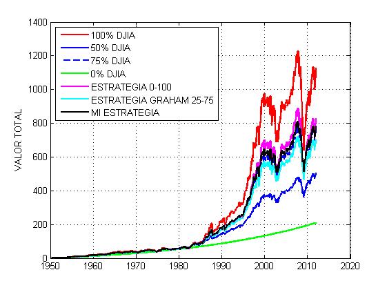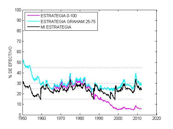 ¿En qué se basa la estrategia? Se basa en las ideas de Graham. Graham recomienda una inversión en acciones de entre el 25% y el 75%, o un 50% de acciones y 50% de efectivo para no perder la cabeza. Pero decir esto es como no decir nada. Seguro que te surgen un montón de preguntas, entre ellas si realmente funciona. Lo que voy a hacer es plantear la estrategia, y como es tan simple las dudas se resuelven pensando un poco. Suerte!