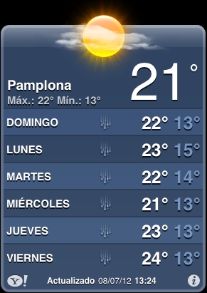 Soy de Pamplona, gran ciudad, y hace poco fueron los sanfermines. Pues resulta que el día 8 de julio a las 13:24 de la tarde el pronóstico meteorológico era el siguiente. Guardé la foto porque sabía que esto iba a pasar…