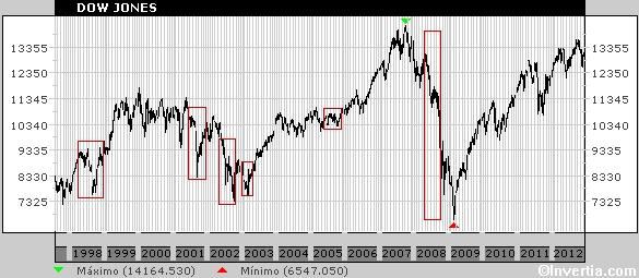 Y para terminar cazo los periodos de más de 60 sesiones en los que el precio y el indicador han ido en divergencia. Desde 1999 he encontrado 6 periodos en los que esto se cumple. Están en la siguiente gráfica. ¿Qué significa esto? En esos periodos la mayoría de los valores han estado en divergencia con sus precios, con lo cual son buenos periodos para cazar valores interesantes tirados de precio, y además los índices generales han bajado de forma notable con lo que es probable que la revalorización se de en un futuro cercano.