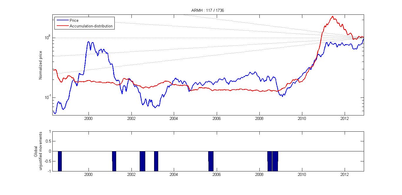 Lo que si hay que hacer es seleccionar de forma cuidadosa los valores, mirando su evolución y su indicador de acumulación-distribución. Debajo pongo un ejemplo interesante, de la empresa ARMH. Se ve que los cracks desde el 2002 a pesar de haber afectado a su precio no le han afectado para nada a la forma de valorar sus acciones a los dueños. También se ve una burbuja que estalla en el año 2000.