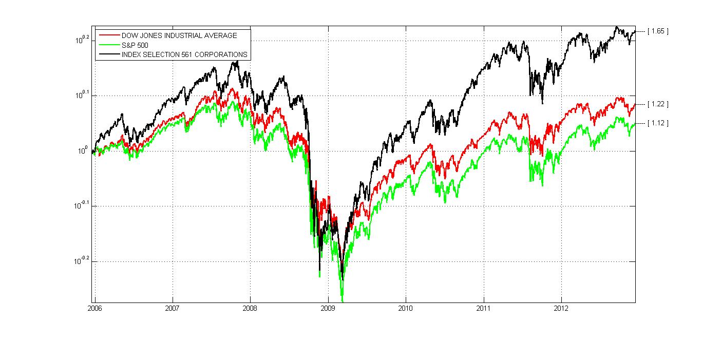La lista resultante es de 561 valores, al final del artículo pego los símbolos de todos ellos en yahoo finance. Y el gráfico del índice resultante de todos ellos construido como he descrito antes es el de la figura siguiente. Se ve que comparado con el SP500 y el DJIA se comporta bastante mejor, desde el 1 de enero de 2006 que es la fecha que he seleccionado como referencia ha crecido un 65% mientras que el DJIA ha crecido un 22% y el SP500 un 12%. Hay que decir que beneficios pasados no garantizan beneficios futuros, por eso el comportamiento en 2013 de este índice no tiene por qué superar al DJIA o al SP500, eso lo veremos el 1 de enero de 2014.