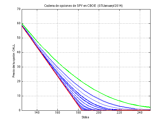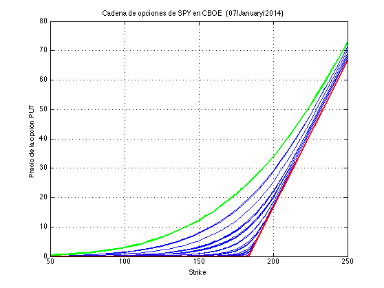 Lo primero es bajarse de la web del CBOE (Chicago Board Options Exchange) la cadena de opciones entera, desde aquí: http://www.cboe.com/DelayedQuote/QuoteTableDownload.aspx Escribimos por ejemplo SPY y le damos a descargar. Luego eliminamos las que no nos interesen, las que no terminen en "-E" las eliminamos porque son negociadas en otros mercados, y las que empiecen por SPY7 también las eliminamos porque son mini. Después de ese trabajo nos habremos quedado con unas pocas miles de opciones y sus precios. ¿Qué significa el nombre de la opción? Las primeras tres letras son el subyacente. Las dos siguientes son el año de vencimiento, las dos siguientes el día de vencimiento y la letra el mes de vencimiento. La correspondencia entre la letra y el mes la puedes ver aquí: http://www.cboe.com/TradTool/strikepricecode2.aspx Por último el nombre termina con el strike y el mercado. Por ejemplo SPY1410A137-E es la opción CALL del SPY con vencimiento 10 de enero de 2014 y strike 137 en el mercado CBOE. Aquí tienes algo de ayuda adicional: http://www.cboe.com/DelayedQuote/QuoteHelp.aspx