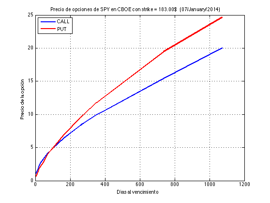 ¿Cómo se interpreta esta gráfica? La linea verde es el precio de las opciones de vencimiento más lejano. La linea roja es la asíntota a la que tiende el precio conforme el vencimiento se acerca. Cada linea azul es la cadena de opciones para una fecha determinada de vencimiento. Imagínate que compramos una call a strike 183 a un vencimiento cualquiera. Una vez que la compramos no podemos cambiar ni el strike ni el vencimiento de la opción, para eso tendríamos que venderla, es decir que estamos atrapados en un strike y en la linea azul de nuestro vencimiento. Cuando el precio del SPY aumenta, la gráfica de la cadena se desplaza hacia la derecha ya que el vértice coincide con el precio del SPY, y como nosotros estamos atrapados en un strike y en una línea azul, nos desplazamos hacia arriba, es decir, el precio de nuestra opción aumenta. Si el SPY disminuye de precio nuestra opción también se deprecia. Además con el paso del tiempo nuestra linea azul se aleja de la verde y se acerca hacia la roja, esto hace que nuestra opción caiga de precio. Y además las circunstancias del mercado pueden hacer que la figura se ensanche o se contraiga, de forma que nuestra linea azul se acarque o aleje de la roja disminuyendo o aumentando el precio de nuestra opción.