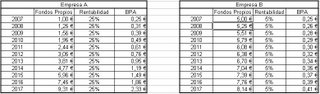 Fijaos en ambas empresas, tanto A como B, obtienen este año un beneficio por acción de 0.25 € por acción, sin embargo A es capaz de conseguir una rentabilidad de sus fondos propios del 25 % mientras que B solo es capaz de rentabilizar un 5 % sus fondos propios. Al cabo de 10 años, podemos observar que A aun partiendo de un capital 5 veces menor, consigue alcanzar los 9,31 € de capital, mientras que B solo consigue 8,14 €.