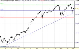Es una constante ahora que la situación se complica ver por todos los foros análisis del tipo: “esto huele mal...”, “de aquí nos vamos a los 14000...”, “esto no lo para nadie...”, “si rompe tal soporte nos iremos muy abajo...”; No digo que estos análisis no sean ciertos, sino mas bien pienso que están enfocados en el corto plazo; con una subida desde mínimos, cercana al 200 % no podemos asustarnos por una corrección de 1000 puntos (aunque esta sea un 10 %)