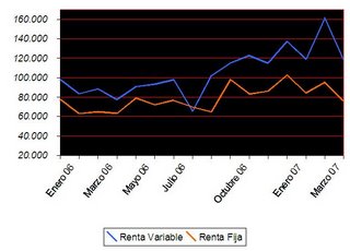 Observando el gráfico vemos que la situación que comentaba antes, parece estar lejos de suceder, ni el volumen de los mercados de renta variable desciende, ni el de la renta fija asciende, habiendo entrado este ultimo en un “pequeño bache” desde el pasado diciembre y demostrando el primero muchísima fuerza desde abril del 2006 (con solo una caída brusca en agosto).