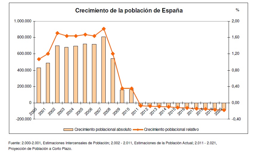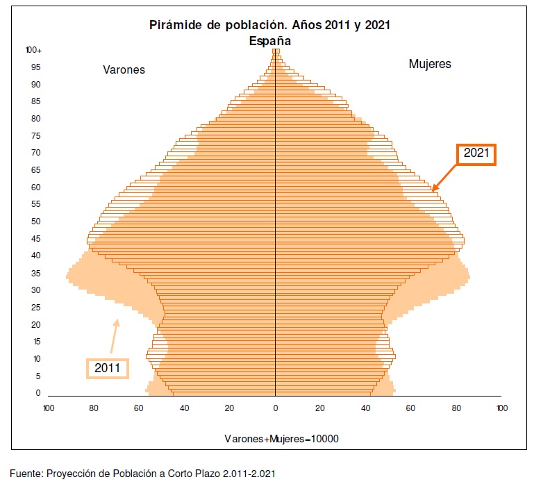 Resulta evidente por tanto que el proceso de formación de familias se vea aplazado no solo por las dificultades económicas e inestabilidad laboral, si no porque no disponen de un lugar adecuado donde poder asentarse y crear un proyecto de futuro sólido. Ello afectará directamente en la tasa de natalidad y en la pirámide demográfica española. Esto supone un problema en un país cuya pirámide demográfica cada vez se va viendo con más claridad que no tiene posibilidad de solucionar el sistema público de pensiones con más de lo mismo. Suponiendo que la previsión demográfica para España sea de perder solo medio millón de población en los próximos 10 años como maneja el INE (que ya me parece muy optimista, demasiado), vemos que la pirámide demográfica se queda seriamente dañada y que provocará un colapso del sistema público de pensiones antes de 2030 si no cambian su modelo de funcionamiento.