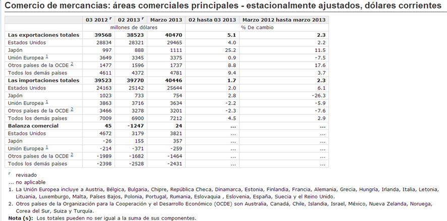 Las exportaciones crecieron de 40.5$ mil millones en marzo y ha habido una tendencia al alza desde julio de 2012 Las ganancias se registraron en todos los sectores durante el mes y los volúmenes de exportación aumentaron un 5,1%.