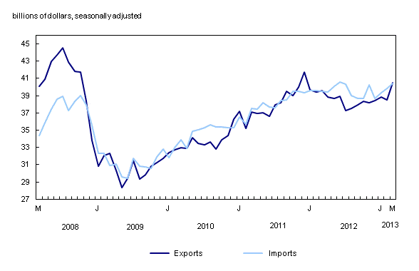 Las exportaciones a Estados Unidos aumentaron 4.0% a $ 29,500,000,000 en marzo, el aumento de las exportaciones de vehículos de motor y sus partes y productos energéticos. Las importaciones procedentes de los Estados Unidos subieron un 2,0% a 25,6 millones de dólares, un tercer avance mensual consecutivo. En consecuencia, el superávit comercial de Canadá con los Estados Unidos aumentó de $ 3,2 mil millones en febrero a US $ 3,8 mil millones en marzo.