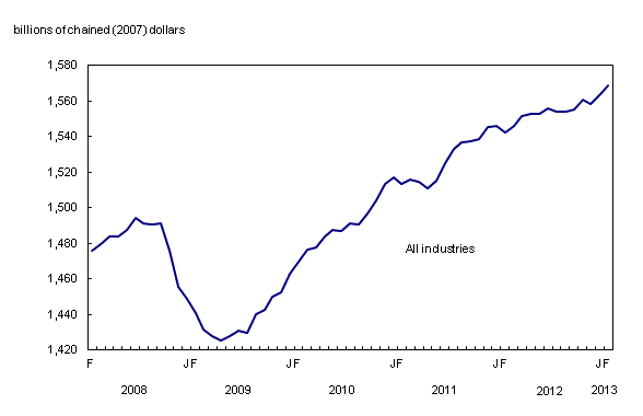 La producción de bienes se expandió 0,9% en febrero, debido principalmente a los aumentos en la minería, la explotación de canteras y extracción de petróleo y gas y en la fabricación. Construcción, servicios públicos, así como el sector agrario y forestal también crecieron. La producción de las industrias de servicios subió un 0,1%, principalmente como resultado de las ganancias en las artes y el entretenimiento, el sector público (educación, salud y administración pública combinada) y el sector financiero y de seguros. Por el contrario, los servicios de alojamiento y alimentación, servicios administrativos y profesionales y el comercio al por mayor disminuyeron.