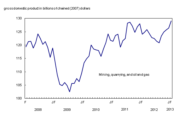Minería, explotación de canteras y extracción de petróleo y gas expandieron 2.2% en Febrero, un quinto aumento mensual consecutivo. Explotación de minas y canteras (con exclusión de extracción de petróleo y gas) creció 6.4% como resultado de un aumento significativo de la producción en las minas de potasa. Minerales metálicos y las minas de carbón también aumentaron en febrero.