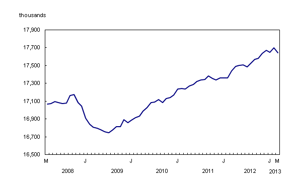 A pesar del descenso en marzo, el empleo fue del 1.2% o 203.000 por superior al año pasado, con el aumento principalmente del trabajo a tiempo completo. Durante el mismo período, el número total de horas trabajadas también se incrementaron en un 1,2%.