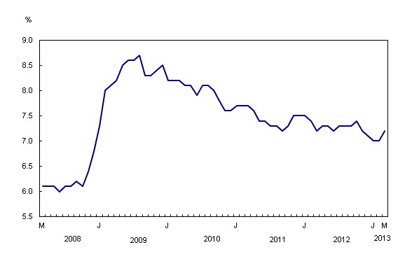 A raíz del aumento del mes anterior, el empleo se redujo en 55.000 en marzo, todo el tiempo completo. La tasa de desempleo aumentó 0,2 puntos porcentuales, hasta el 7,2%.