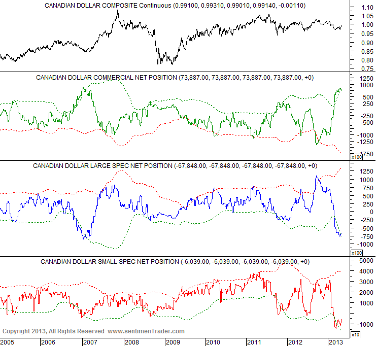 Nos indica que las posiciones de operadores comerciales y large especuladores están en zonas extremas y el precio suele revertir en estos casos, o lo que es lo mismo que los alcistas pueden dominar en el dólar canadiense.
