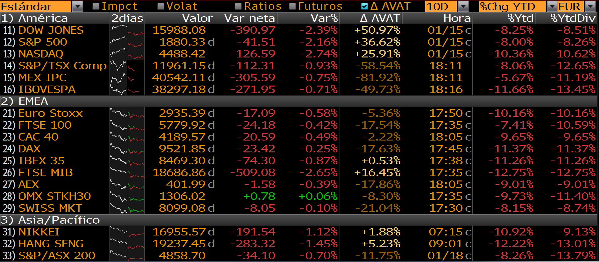 A continuación adjunto una imagen con los principales índices de renta variable, en esta se puede ver las grandes caídas que acumulamos desde hace tan solo 15 días, teniendo en cuenta que de los cuales solo 10 días han sido laborables los retrocesos son bastante considerables. La incertidumbre y la volatilidad han entrado con fuerza en este nuevo año llegando a disparar el índice de volatilidad del VIX en un 51,88%.