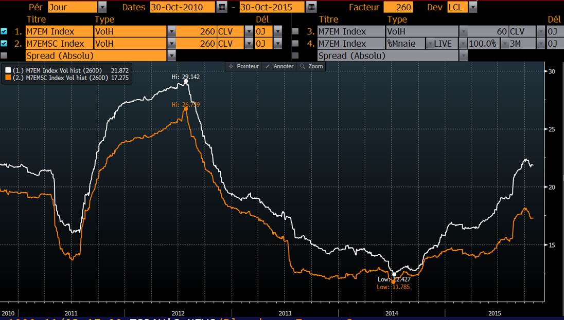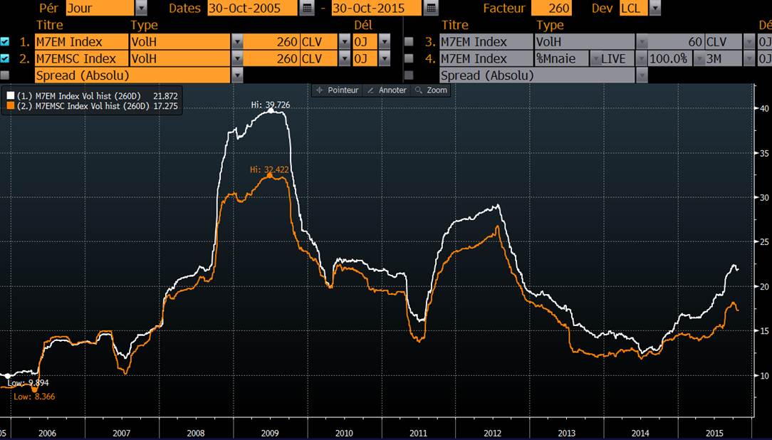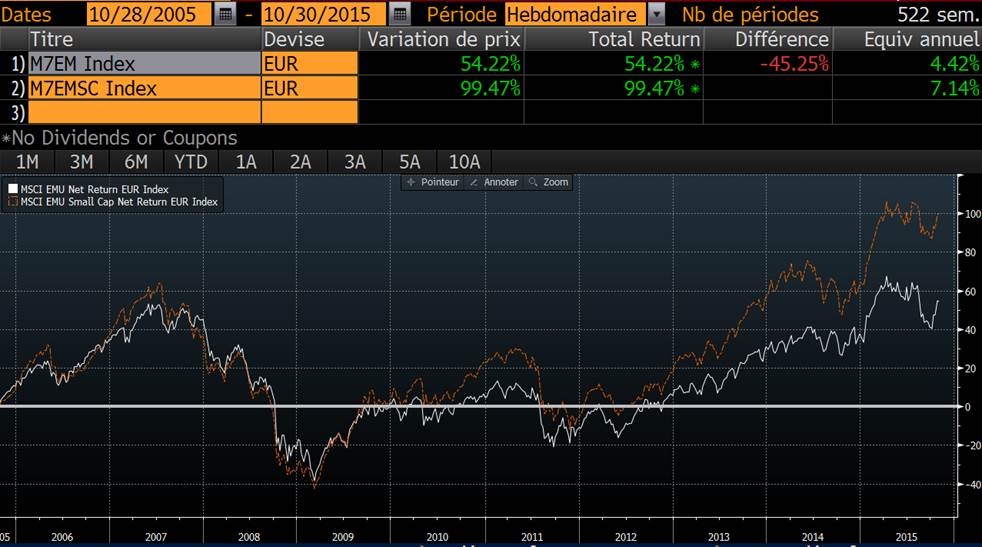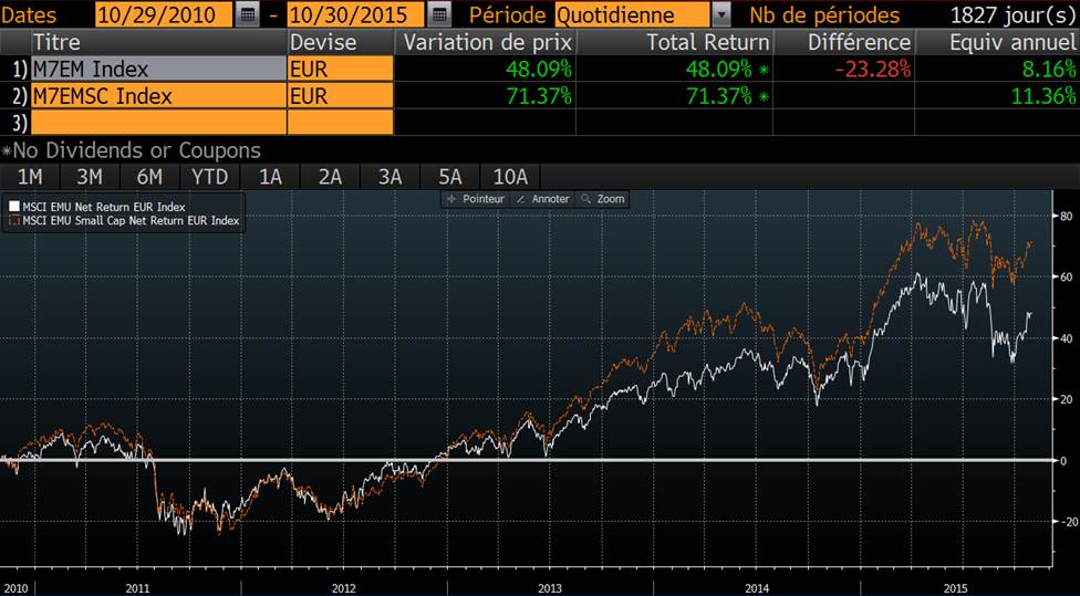 A continuación adjuntamos dos imágenes con los retornos de empresas de pequeña capitalización de la zona euro (M7EM Index) frente a las de gran capitalización (M7EMSC Index) de la zona euro a largo plazo, en los periodos de 5 y 10 años.