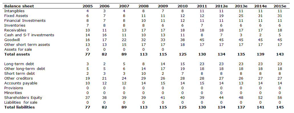 En cuanto a flujo de caja, reconozco que no he “apretado” en cuanto a capital circulante ya que no suele ser un elemento muy importante para HP (en relación con sus ingresos no supera el 2%). Lo que sí es importante, como ya señalé más arriba, son las inversiones, el capex. ¿Qué nivel utilizar? En 2011 se invirtieron 14.000MnUSD. En la primera mitad de este año el nivel de inversión cayó un -38%, y ésa es la referencia que he usado para 2012. En los años siguientes he mantenido el nivel de inversión plano a pesar de la caída en el beneficio.