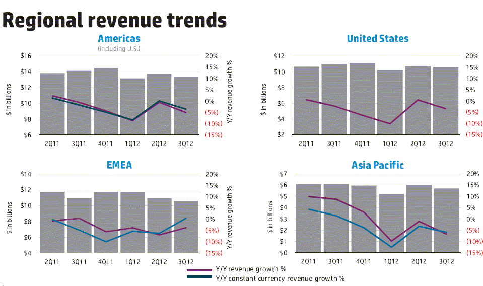 En términos de ingresos HP no acaba de remontar (-5% en 3T12 frente a -3% y -7% en los trimestres anteriores) y las tendencias por regiones son para decir “agárrense que vienen curvas”