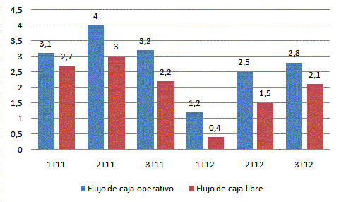 Una tendencia similar a lo que vemos con el EBIT la tenemos con el flujo de caja, todavía está en niveles inferiores a los de 2011 pero va mejorando trimestre a trimestre.