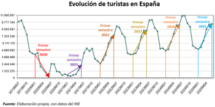 Según el Instituto Nacional de Estadística, durante el primer semestre de 2025 se batió récord de llegada de turistas a España con 44,5 millones de personas; lo que supone un 4,7% de turistas adicionales con respecto al mismo período del año anterior.