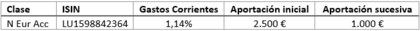 En el siguiente cuadro resumen, te expongo los principales datos de la clase más barata del Fondo, si lo contratas a través del Supermercado de Fondos de Inversión de EBN Banco: