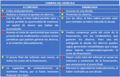 Tanto la compra al contado como la compra financiada tendrán sus ventajas y sus desventajas, para lo que aconsejaría entonces identificarlas mediante una lista como la que propongo a continuación: