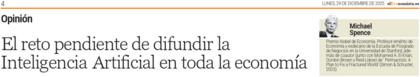 En un artículo del reputado Nóbel de Economía Michael Spence, publicado el 29 de diciembre de 2025 en El Economista, opina que la rentabilidad de la enorme cantidad de inversión destinada al desarrollo de la IA en áreas como infraestructura física, software, adaptación de modelos de negocio, consolidación de datos y desarrollo de capital humano, dependerá del potencial que tenga esa tecnología para crear valor. Y esa creación de valor solo se producirá si los modelos de IA logran adaptarse y adoptarse en toda la economía, ya sea para reducir el coste de los productos y servicios que ya existen, como para crear nuevos bienes y servicios mejorados, y que faciliten el desarrollo económico y social. Pero hasta el momento, la adopción de la IA entre los distintos sectores económicos avanza a diferentes velocidades, y su adopción entre los diversos países es desigual. En opinión del autor, sectores como la industria tecnológica, las finanzas y servicios profesionales son los que mejor han acogido a la IA, mientras que otros sectores como la sanidad o la construcción están quedando rezagados en su adopción.
