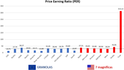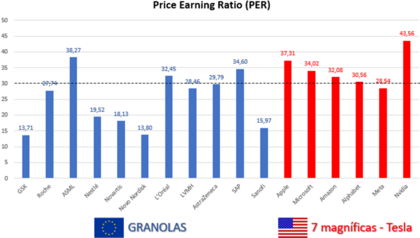 Por lo tanto, con esos PER tan altos para las Siete Magníficas, el mercado está descontando crecimientos futuros muy elevados (IA, plataformas globales, escalabilidad). Mientras que en las GRANOLAS, el valor está más en el negocio actual que en promesas futuras.