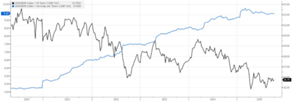 PER (Price Earning Ratio) = Línea negra. Beneficios = Línea azul. La paradoja es evidente: mientras sus beneficios conjuntos han aumentado más de un 25% en el último trienio, sus múltiplos de valoración —el famoso PER (Price Earning Ratio)— se han reducido. En otras palabras, la línea azul de los beneficios sube con fuerza, mientras la línea negra del PER desciende. El resultado es que hoy estas empresas cotizan a precios que, lejos de reflejar una burbuja, muestran un cierto escepticismo del mercado.