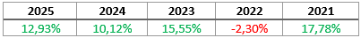 Las rentabilidades anuales alcanzadas por este vehículo de inversión durante el último lustro, son las que se exponen en la siguiente tabla: