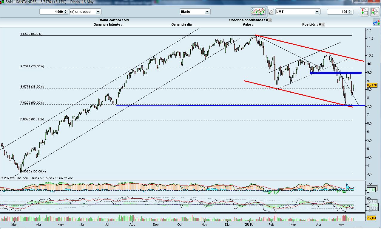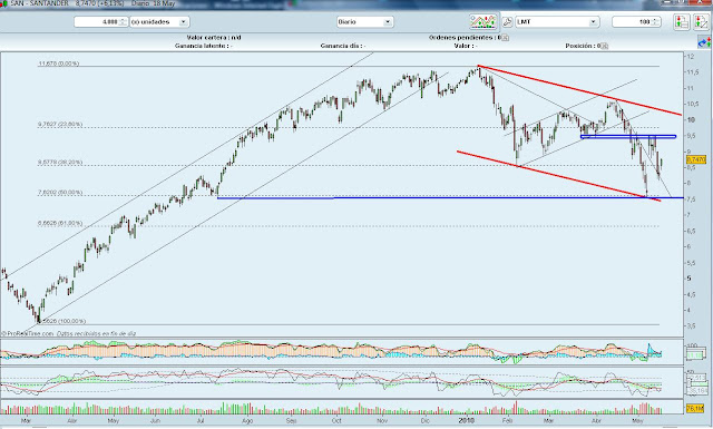 Para el Santander, desde máximos de Enero, el movimiento del precio viene enmarcado por un canal bajista que, en la actualidad, va entre el 7,4 y el 10,2. Se puede ver que en este movimiento se ha parado en el 7,5. Esto significa que ha corregido un 50% del total del movimiento al alza desde mínimos de marzo del 2009.