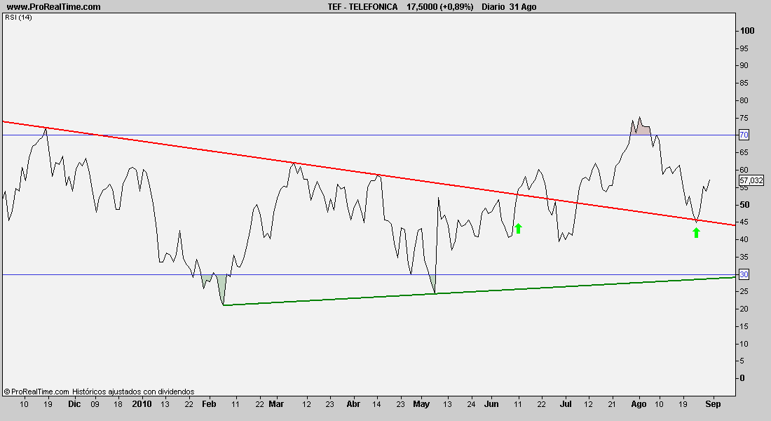 Adicionalmente se puede ver en el gráfico de RSI de Telefónica que se ha producido un rebote en la directriz roja ese mismo día dando una confirmación adicional de la validez de la estrategia reseñada en el anterior post: