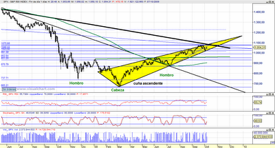 Tras consolidar posiciones ante esta línea de tendencia, mientras que no pierda la base de la cuña ascendente, podríamos esperar la continuación en el rebote alcista, con objetivo ante la banda superior de la figura, donde nos encontramos con la resistencia en 1.075 puntos, y la directriz bajista principal.