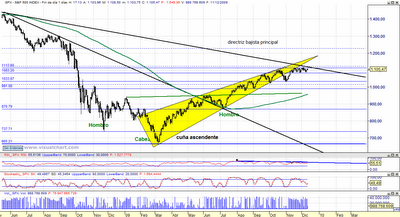 Situación TécnicaEl S&P 500 con el desarrollo de la cuña ascendente, se ha situado ante el retroceso de Fibonacci del 50% de la tendencia bajista previa, en las proximidades de 1.120 puntos, donde nos encontramos en confluencia con la directriz bajista principal.