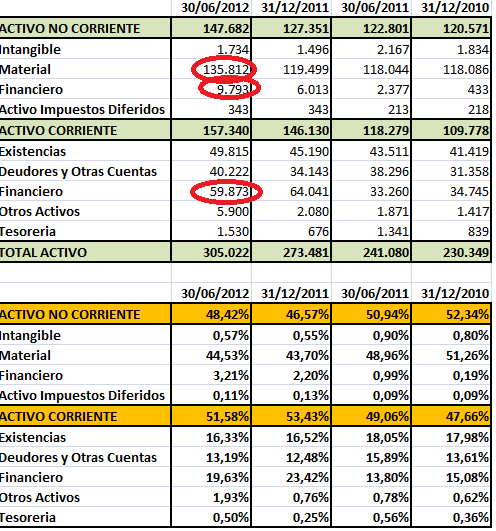 Sí miramos el pie de balance, observamos que el activo total se ha incrementado de manera notable (+30%) en apenas año y medio, como consecuencia de entre otras, un aumento en las inversiones no corrientes, principalmente la nueva planta de Terranova, y en general un aumento en el ámbito operativo que va asociado al incremento de la actividad de la compañía. La partida que más incremento ha tenido se corresponde a las inversiones financieras en valores de renta fija e imposiciones, lo que demuestra la fortaleza de la compañía que le permite invertir los excedente generados en activos financieros que le crean valor en forma de ingreso financiero.