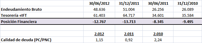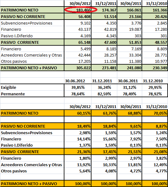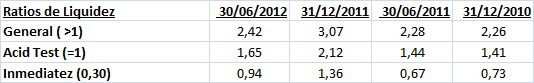 En el cuado inferior se aprecia los ratios de solvencia y cobertura, el primero disminuye de manera significativa desde 2010, como consecuencia de que la mayor parte de los recursos utilizados han venido de fuentes externas, mientras que el peso de la financiación propia ha disminuido, situación lógica teniendo en cuenta las condiciones con las que se está financiando. No obstante, a 30.06.2012 por cada euro recibido de financiación externa, la compañía tiene 2,51 euros en activos para liquidarlo, lo que supone un excelente ratio. El de cobertura, presenta un valor excente como consecuencia de un fondo de maniobra alto.